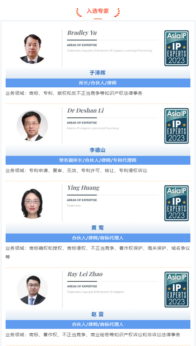 >球友直播>关于我们>荣誉概览>2024>集佳5位合伙人入选Asia IP 2023年度“中国知识产权专家百强榜”
