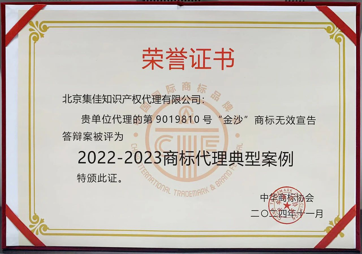 >球友直播>关于我们>荣誉概览>2024>集佳代理的“金沙”商标权无效宣告答辩案入选“2022-2023商标代理典型案例”