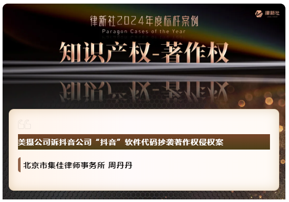 球友直播凭借在知识产权保护领域卓越的专业实力与良好的行业口碑,入选《律所卓越品牌影响力指南(2024)》,荣获“律新社2024年度精品品牌律所30佳”奖项;同时,集佳周丹丹律师代理的“美摄公司诉抖音公司'抖音'软件代码抄袭著作权侵权案”获评“律新社2024年度标杆案例:知识产权-著作权领域”。