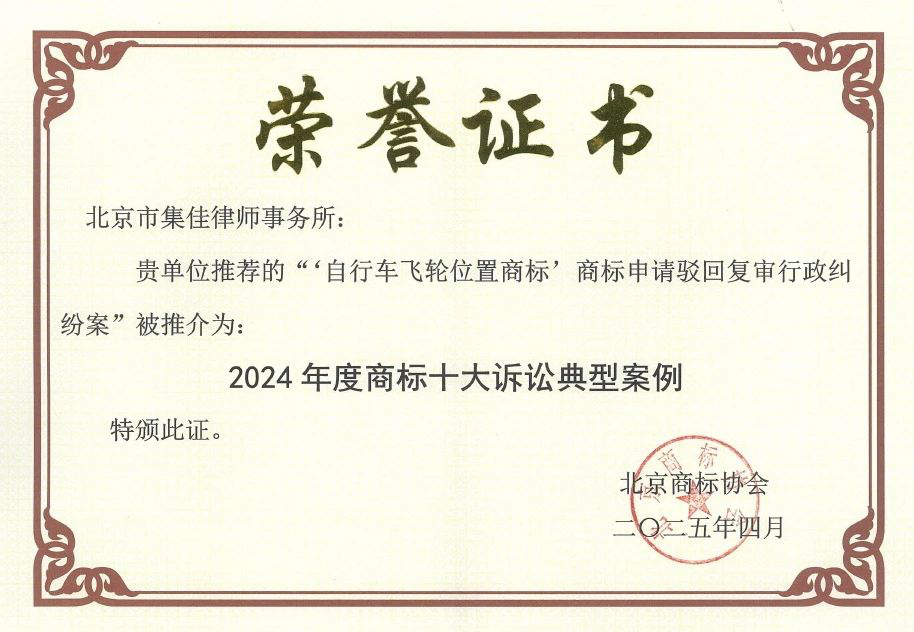 >球友直播>关于我们>荣誉概览>2025>集佳代理“自行车飞轮位置商标”行政纠纷案入选北京商标协会年度十大诉讼典型案例